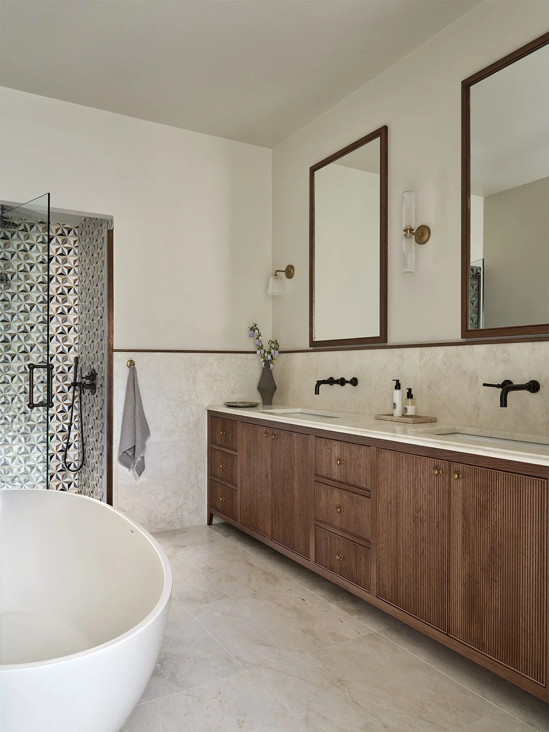Neutral marble and wood bathroom, marble mosaic, reeded bathroom details