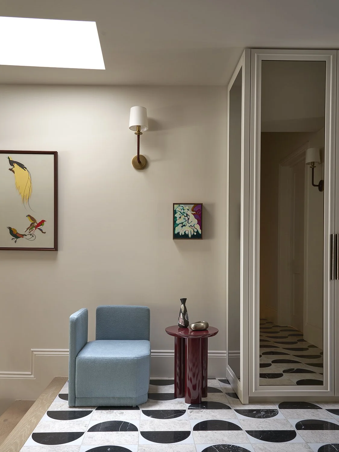 Pierre Frey bespoke chair, Otto Tiles marble tiles, mirrored hallway wardrobe