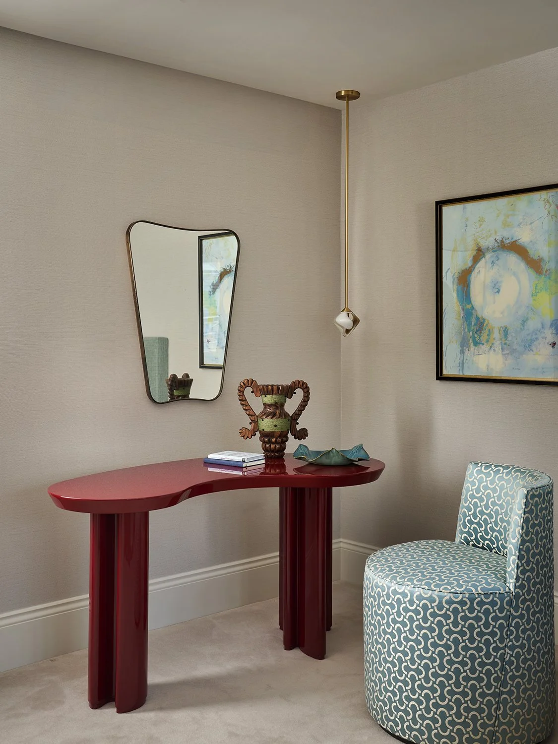 DEDAR Mezzaluna fabric dressing table chair, red console table, Heathfield pendant