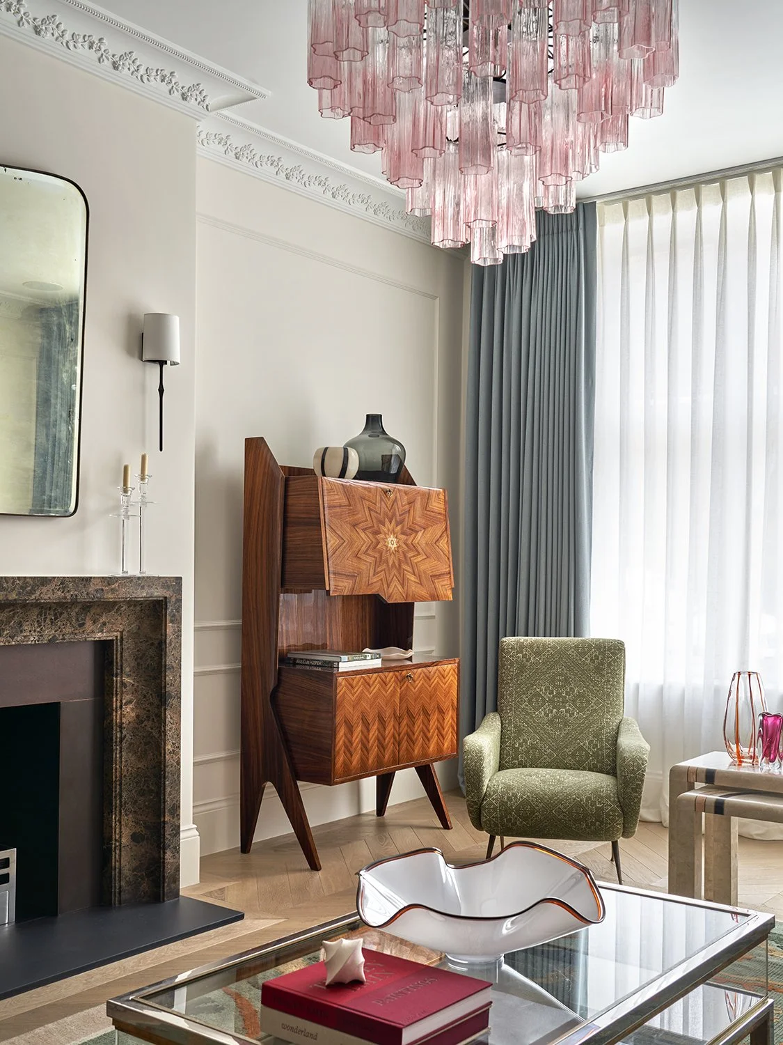 Mid-century Italian drinks cabinet, Italian mid-century chairs, Guy Goodfellow, luxury, eclectic living room, Soho Home chandelier